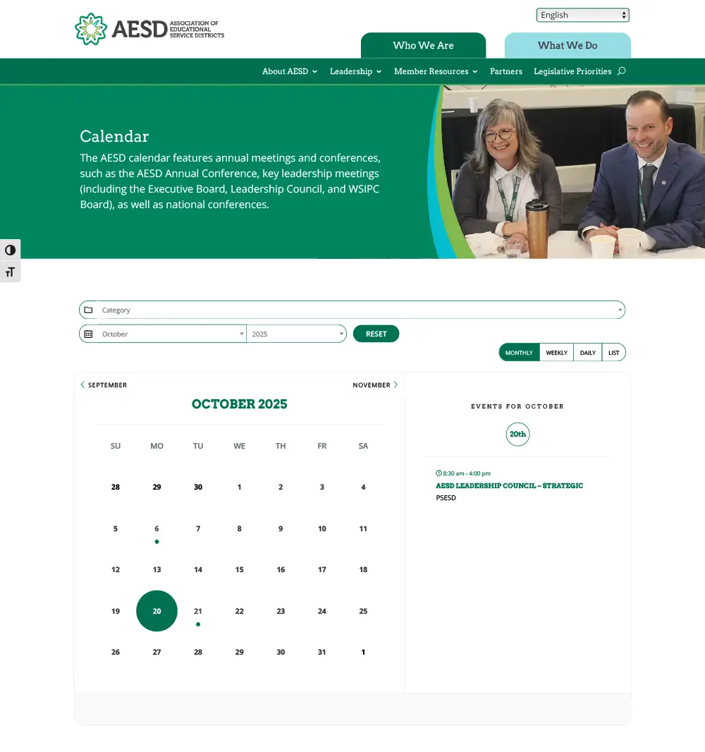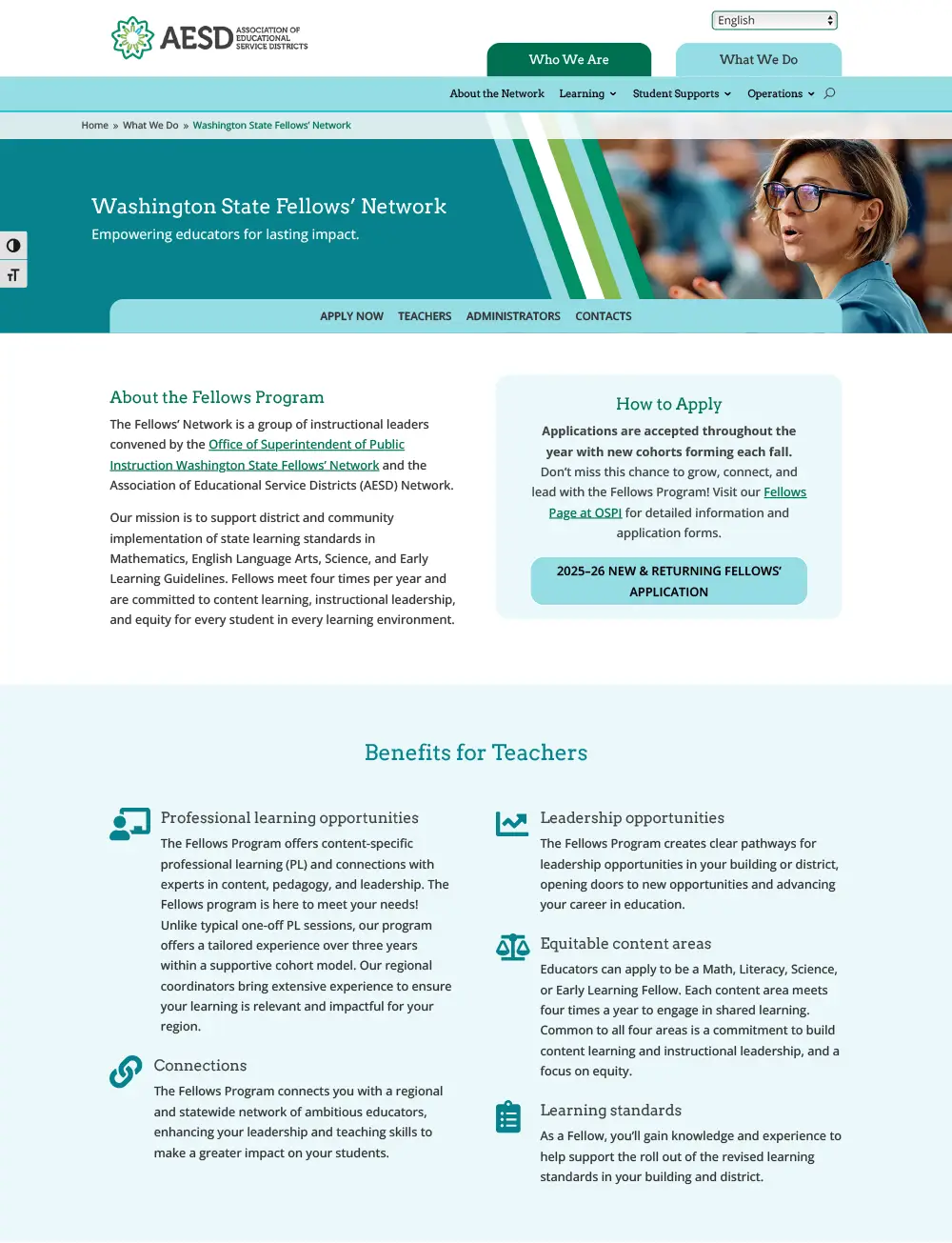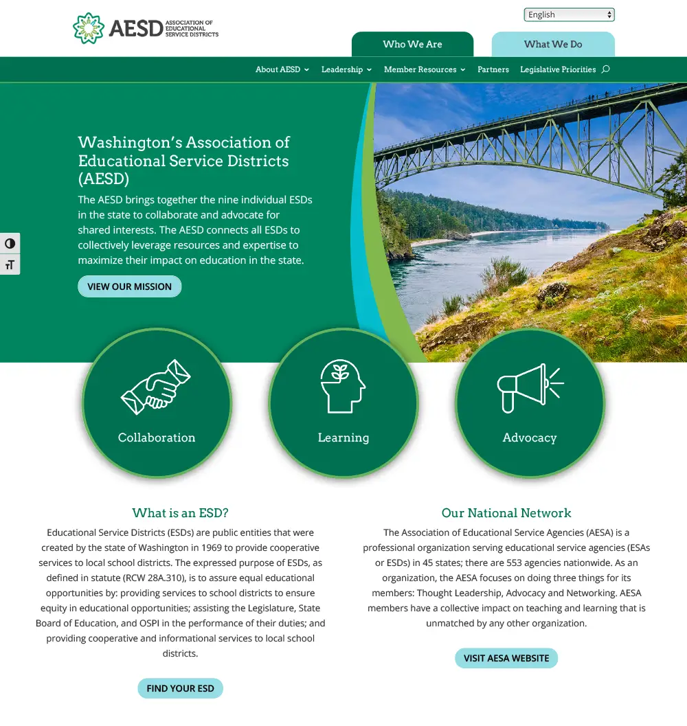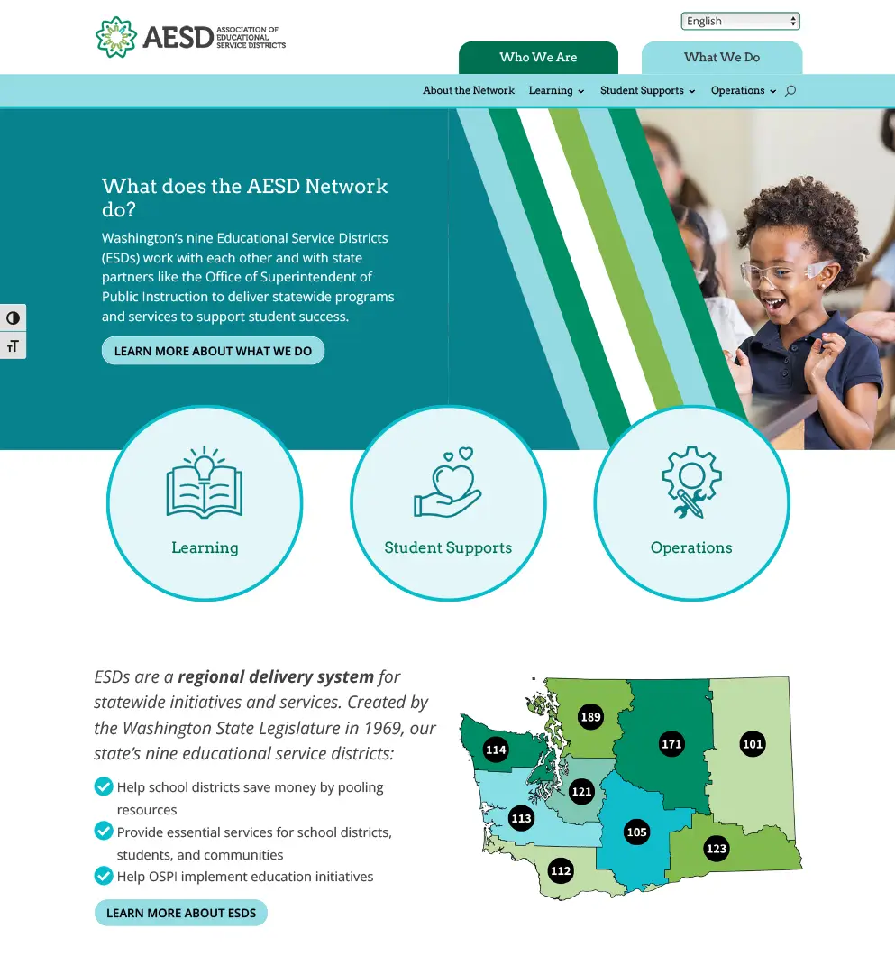 In 2016, we created a responsive website for AESD to support audiences across the state. As the scope of statewide work evolved over time, it became clear the site needed a fresh approach. Through the redesign, we built a more strategic and user-friendly experience—introducing a splash page and intuitive navigation that clearly distinguishes the association from the network and better serves all audiences.